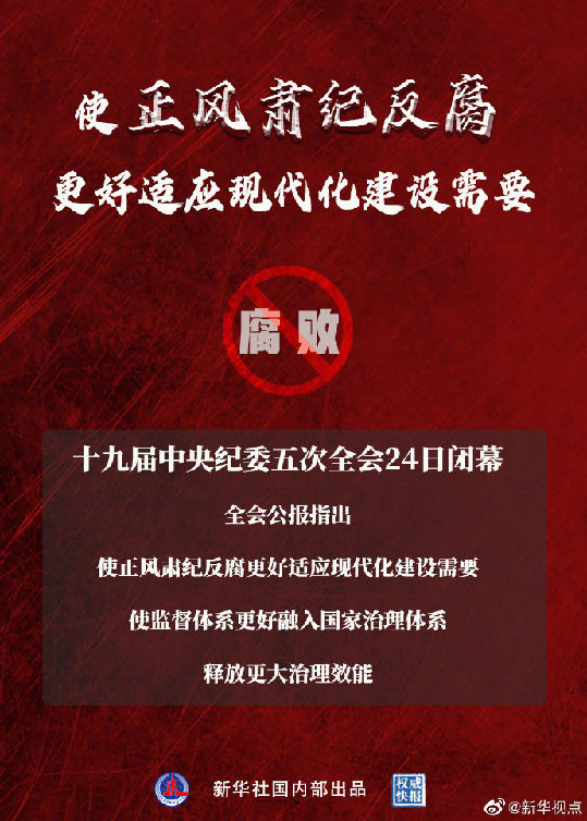 24日,十九屆中央紀(jì)委五次全會(huì)閉幕。全會(huì)公報(bào)指出:使正風(fēng)肅紀(jì)反腐更好適應(yīng)現(xiàn)代化建設(shè)需要,使監(jiān)督體系更好融入國家治理體系,釋放更大治理效能。(記者:朱基釵、孫少龍;海報(bào)設(shè)計(jì):朱舜)?