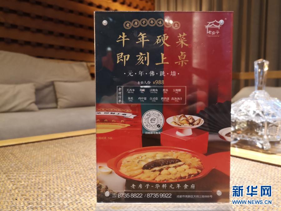 這是2月17日在成都一家中餐廳拍攝的春節(jié)期間推出的半成品“牛年硬菜”佛跳墻的廣告牌(手機(jī)照片)。新華社記者 胡旭 攝