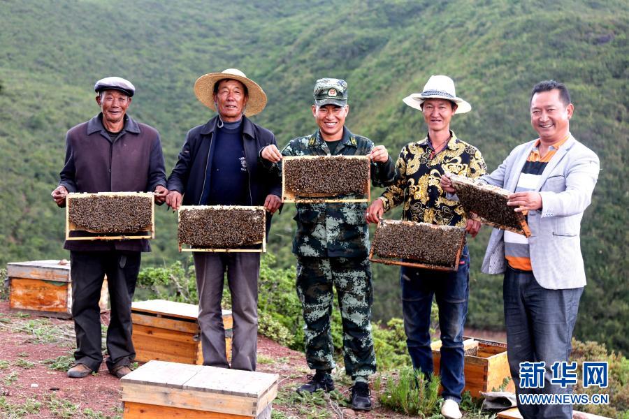 武警四川總隊(duì)涼山支隊(duì)精準(zhǔn)幫扶昭覺縣梭梭拉打村發(fā)展養(yǎng)蜂產(chǎn)業(yè),總隊(duì)駐村扶貧干部布哈(中)和村民一同展示豐收成果(2019年6月12日攝)。新華社發(fā)(楊劍 攝)
