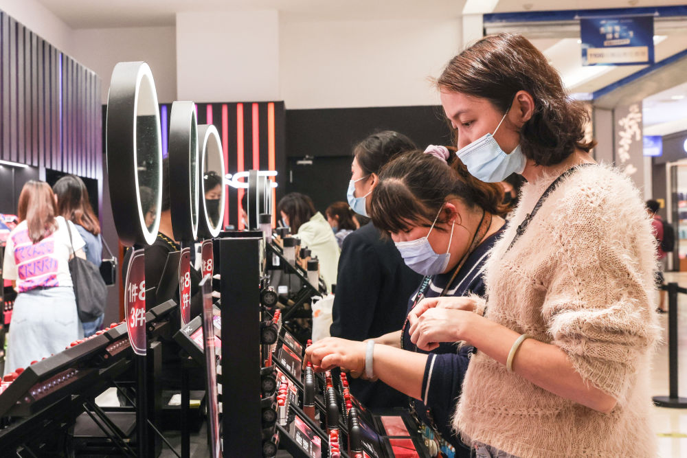 消費(fèi)者在??谌赵聫V場(chǎng)免稅店購(gòu)物。(新華社記者張麗蕓2021年3月25日攝)