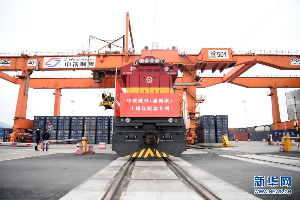 中歐班列(渝新歐)十周年紀(jì)念專列在重慶團(tuán)結(jié)村站等待發(fā)車(3月19日攝)。新華社記者 唐奕 攝