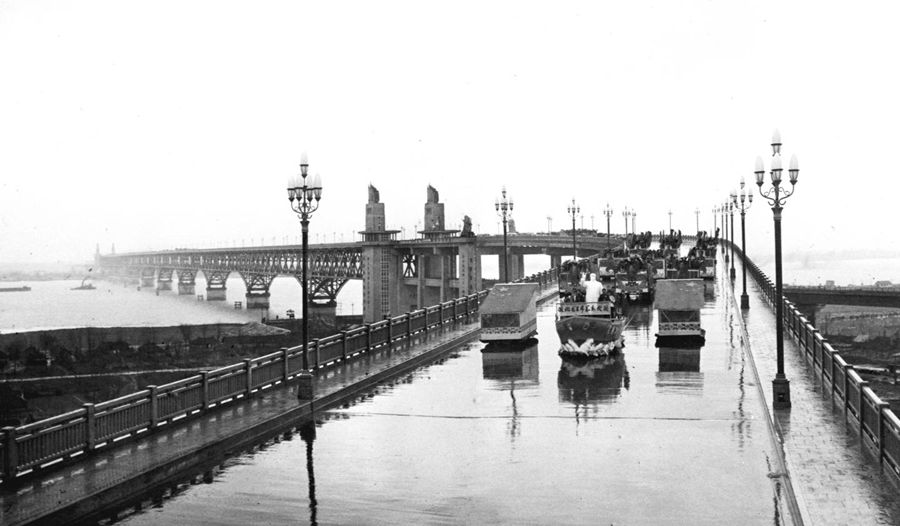 1968年12月29日,南京市5萬(wàn)多軍民歡聚在江邊橋頭,隆重舉行大會(huì),慶祝南京長(zhǎng)江大橋全面建成。慶祝大會(huì)結(jié)束后,紅色的信號(hào)彈騰空而起,在一片鞭炮和鑼鼓聲中,100多輛滿載南京群眾代表的彩車徐徐通過(guò)公路橋。頓時(shí),大江南北,橋上橋下,車內(nèi)車外,一片歡騰,歡呼聲震撼大地,響徹云霄。