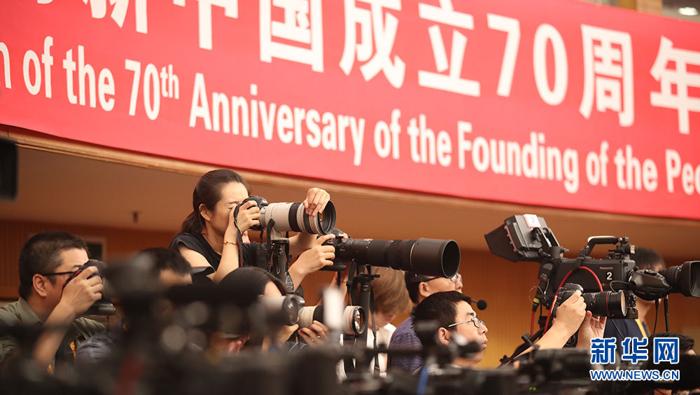 9月24日,慶祝中華人民共和國成立70周年活動新聞中心在北京梅地亞中心二層新聞發(fā)布廳舉辦第一場新聞發(fā)布會。圖為采訪新聞發(fā)布會的媒體記者。新華網記者 陳競超 攝