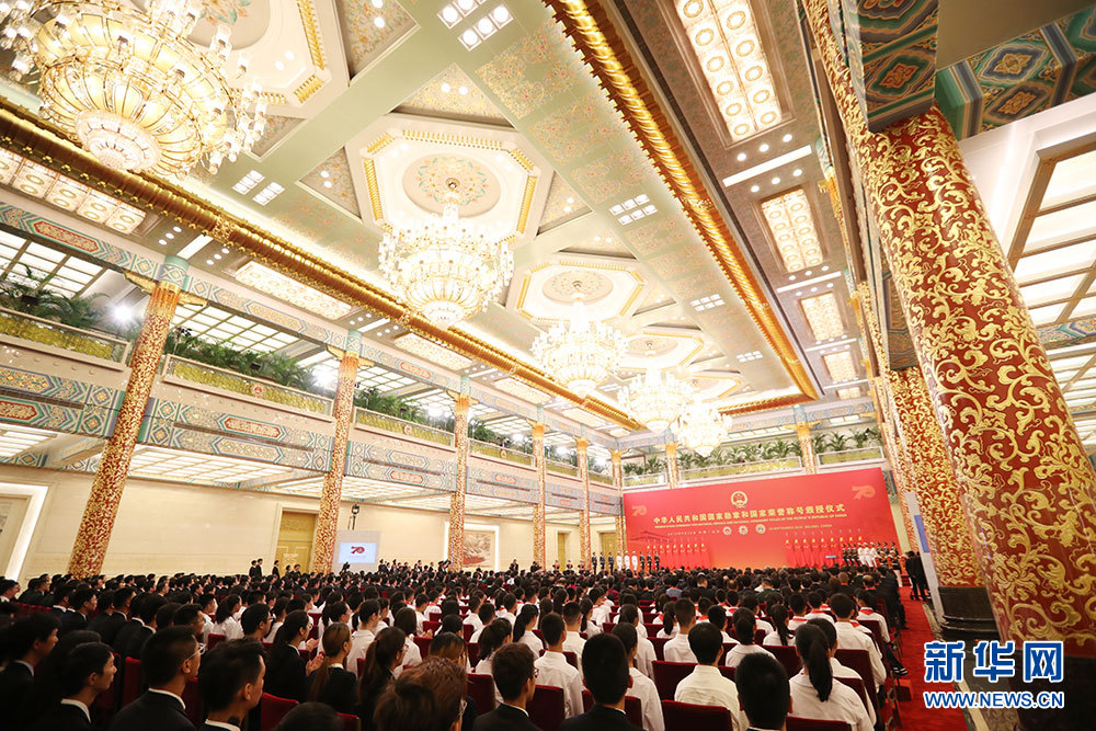 ??? 9月29日上午10時(shí),中華人民共和國國家勛章和國家榮譽(yù)稱號頒授儀式在人民大會(huì)堂隆重舉行。圖為頒授儀式現(xiàn)場。新華網(wǎng) 陳杰 攝