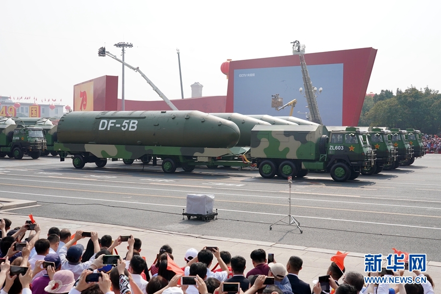 10月1日上午,慶祝中華人民共和國成立70周年大會在北京天安門廣場隆重舉行。這是東風(fēng)-5B核導(dǎo)彈方隊。 新華社記者 楊世堯 攝