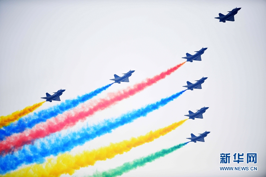 新華社北京10月1日電(張汨汨、周正新)1架空警-2000預(yù)警機(jī)和8架殲-10飛機(jī)組成領(lǐng)隊(duì)機(jī)梯隊(duì),10月1日飛臨天安門(mén)廣場(chǎng)上空接受檢閱。殲-10飛機(jī)拉出七道絢麗的彩煙,慶祝新中國(guó)成立70周年。