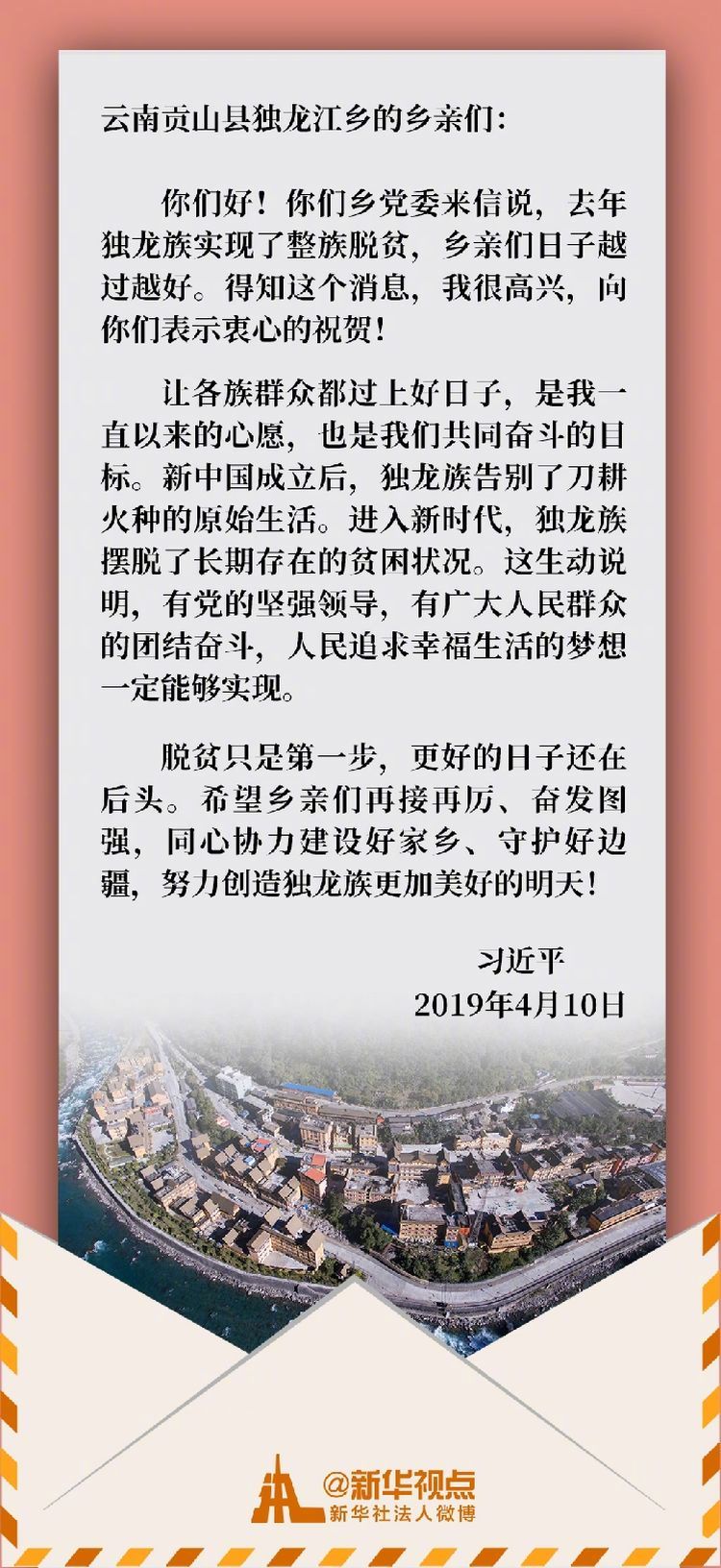 這一天,習近平總書記給他們回信??倳浽谛胖凶YR獨龍族實現整族脫貧,勉勵鄉(xiāng)親們?yōu)檫^上更加幸福美好的生活繼續(xù)團結奮斗。
