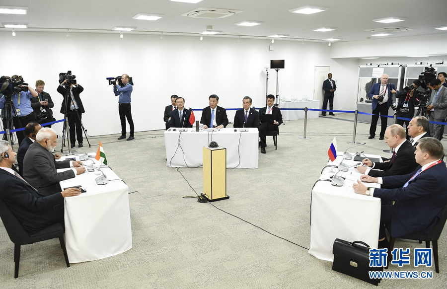 6月28日,國(guó)家主席習(xí)近平在大阪出席中俄印領(lǐng)導(dǎo)人會(huì)晤,同俄羅斯總統(tǒng)普京、印度總理莫迪就當(dāng)前國(guó)際形勢(shì)、重大國(guó)際和地區(qū)問題、三方合作深入交換意見。 新華社記者 謝環(huán)馳 攝
