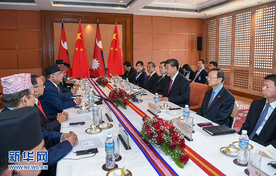 10月13日,國家主席習(xí)近平在加德滿都下榻飯店會見尼泊爾共產(chǎn)黨聯(lián)合主席普拉昌達(dá)。 新華社記者 謝環(huán)馳 攝