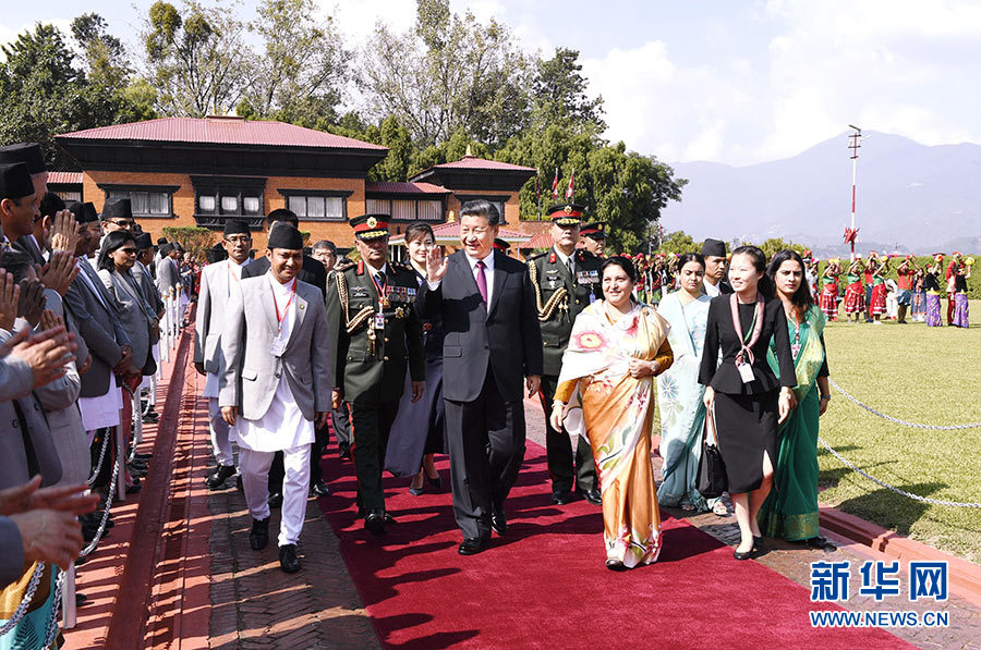 當?shù)貢r間10月13日中午,國家主席習(xí)近平離開加德滿都啟程回國。尼泊爾總統(tǒng)班達里在機場為習(xí)近平舉行隆重歡送儀式。尼泊爾副總統(tǒng)普恩、總理奧利、聯(lián)邦議會聯(lián)邦院主席蒂米爾西納、所有內(nèi)閣成員、軍方高級將領(lǐng)參加。 新華社記者 高潔 攝