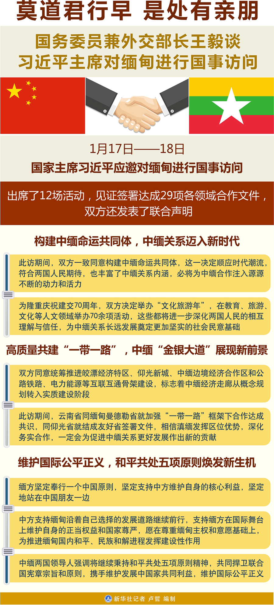 王毅說(shuō),習(xí)近平主席新年首訪緬甸,是黨中央著眼外交全局采取的一次重大周邊外交行動(dòng),此訪時(shí)間雖短,但日程緊湊,成果豐碩。習(xí)近平主席出席了12場(chǎng)活動(dòng),見證簽署達(dá)成29項(xiàng)各領(lǐng)域合作文件,雙方還發(fā)表了聯(lián)合聲明。緬方對(duì)習(xí)近平主席此訪期待已久,給予最高禮遇隆重接待。緬甸總統(tǒng)溫敏和國(guó)務(wù)資政昂山素季聯(lián)袂出席重大活動(dòng),緬甸第一、第二副總統(tǒng)及所有內(nèi)閣成員、聯(lián)邦議會(huì)兩院議長(zhǎng)以及主要政黨負(fù)責(zé)人悉數(shù)出面,陪同習(xí)近平主席出席中緬建交70周年系列慶?;顒?dòng)暨中緬文化旅游年啟動(dòng)儀式。