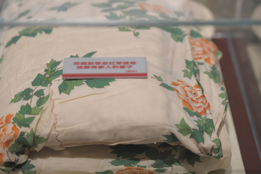 “在湖南汝城縣沙洲村,3名女紅軍借宿徐解秀老人家中,臨走時,把自己僅有的一床被子剪下一半給老人留下了?!?/p>