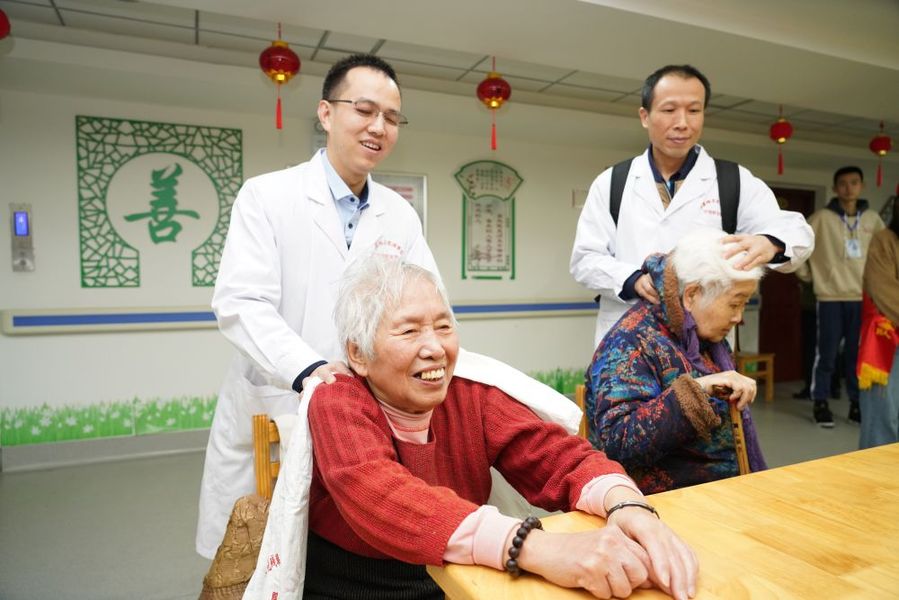 三明市盲協(xié)主席江華帶領(lǐng)盲人志愿團(tuán)隊(duì)為社區(qū)老人按摩推拿。周志鴻 攝