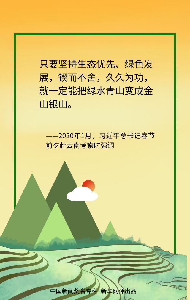 綠色發(fā)展道阻且長,但行則將至。生態(tài)治理、實現(xiàn)人與自然和諧共生仍有不少“硬骨頭”要啃。我們既要有除弊治病的決心,又要有遵循規(guī)律辦事的自覺,既要有只爭朝夕的精神,更要有持之以恒的堅守,以綿綿之力久久為功,腳踏實地地推進美麗中國建設,一處處“詩意棲居”的綠水青山必將變成一座座金山銀山。(文字:徐可 海報:滕華)