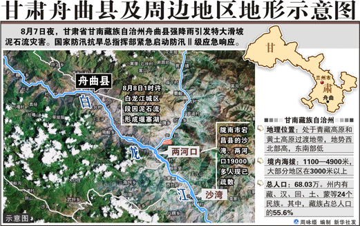 舟曲縣位于甘肅南部,甘南藏族自治州東南部,東鄰武都縣,北接宕昌縣,西南與迭部縣、文縣和四川省九寨溝縣接壤。全縣總面積3010平方公里,轄20個(gè)鄉(xiāng)、2個(gè)鎮(zhèn),210個(gè)行政村,總?cè)丝?3.47萬人,其中藏族4.4萬人,占32.78%。