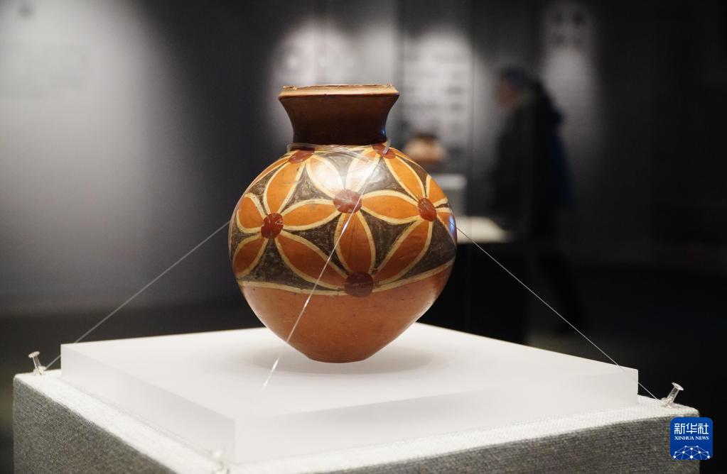 2月9日,在孔子博物馆举行的山东文物精品展上拍摄的山东省文物考古研究院收藏的大汶口文化花瓣纹彩陶壶。