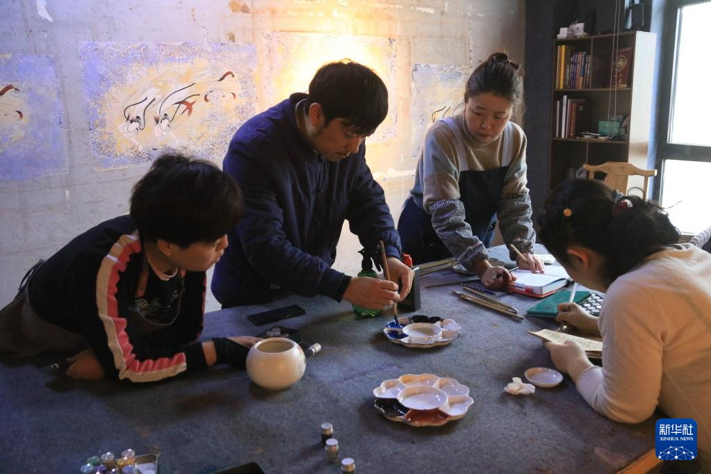 2月22日,在敦煌小镇鸣沙书院,艺术工作者张杰龙(中)指导学员进行颜料调色。