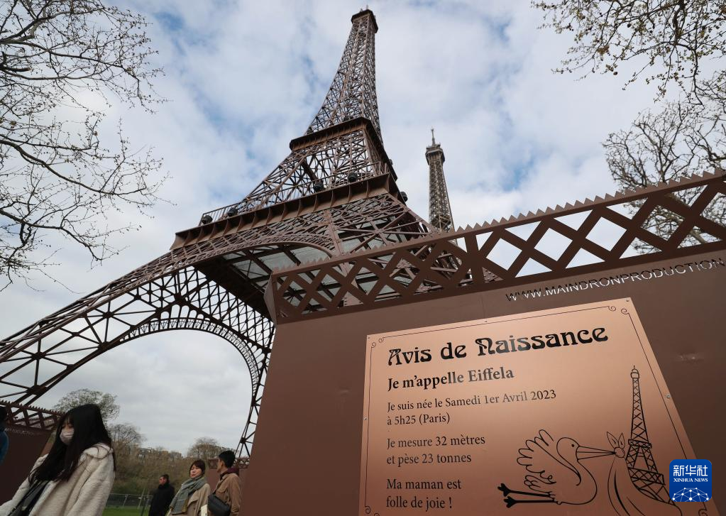 这是4月3日在法国巴黎拍摄的埃菲尔铁塔(后)和“小埃菲尔铁塔”。
