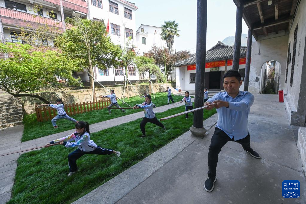 4月12日,诸暨市东白湖镇斯民小学的学生在学习传统武术舞剑。