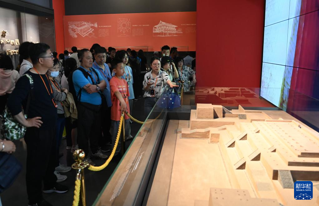 5月11日,游客在陕西历史博物馆了解唐长安城布局。