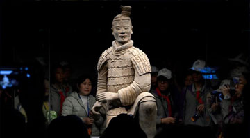 5月8日,游客在西安博物院参观唐代三彩腾空马。飞腾的三彩马上骑有一胡俑,真实再现了丝绸之路上西域胡人急奔长安的生动形象。
