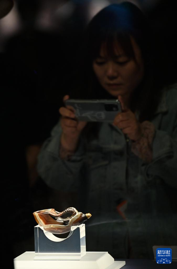 5月11日,游客在陕西历史博物馆参观镶金兽首玛瑙杯。镶金兽首玛瑙杯的造型,与起源于古希腊的酒具“来通”相似,“来通”曾广泛流行于中亚、西亚地区,沿着丝绸之路不断东传进入中国。