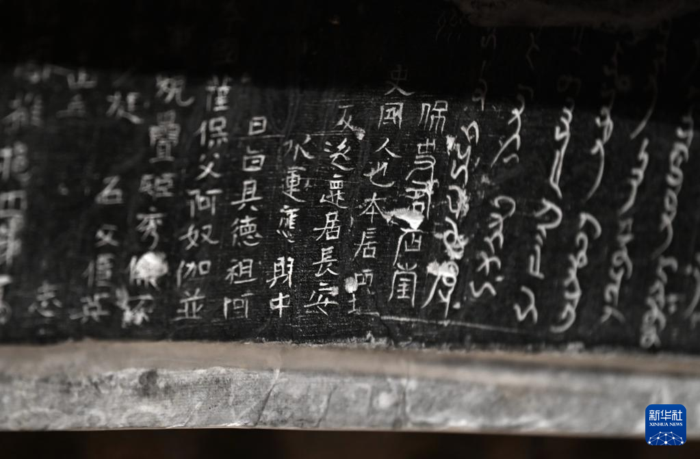 这是在西安博物院展出的史君墓石椁,椁门门楣上用汉文和粟特文刻着墓主墓志(5月8日摄)。墓主史君是北周凉州萨保,粟特人。石椁整体为中国传统歇山顶殿堂式建筑,四壁浮雕内容和风格则带有鲜明的西域特色。