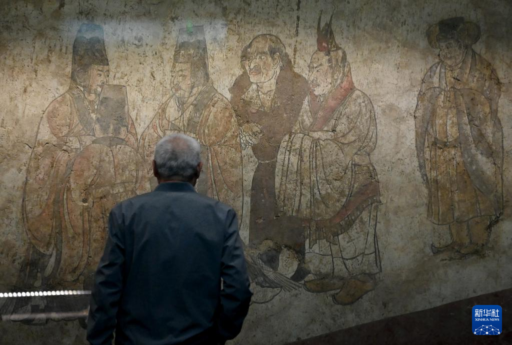 5月11日,游客在陕西历史博物馆内观看唐章怀太子墓《客使图》。《客使图》描绘的是唐代外交机构鸿胪寺官员接待外国使节的场景。
