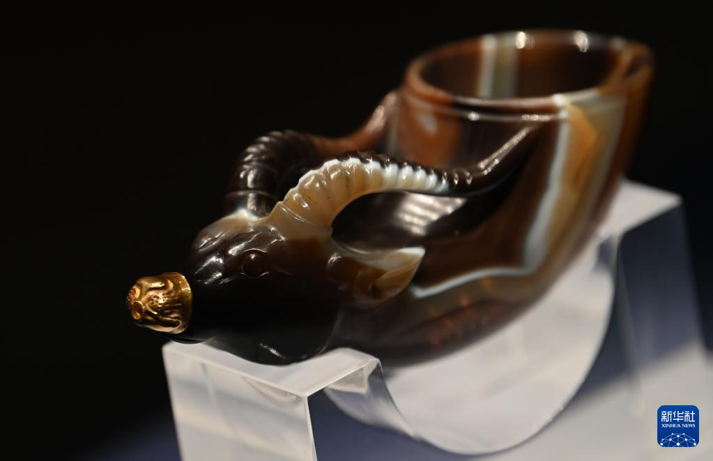 这是在陕西历史博物馆拍摄的镶金兽首玛瑙杯(5月11日摄)。镶金兽首玛瑙杯的造型,与起源于古希腊的酒具“来通”相似,“来通”曾广泛流行于中亚、西亚地区,沿着丝绸之路不断东传进入中国。