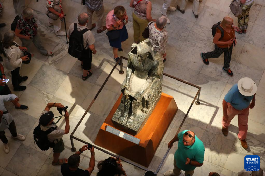 5月16日,在位于埃及首都开罗的埃及博物馆,人们走过古埃及法老门图荷太普二世的坐像。