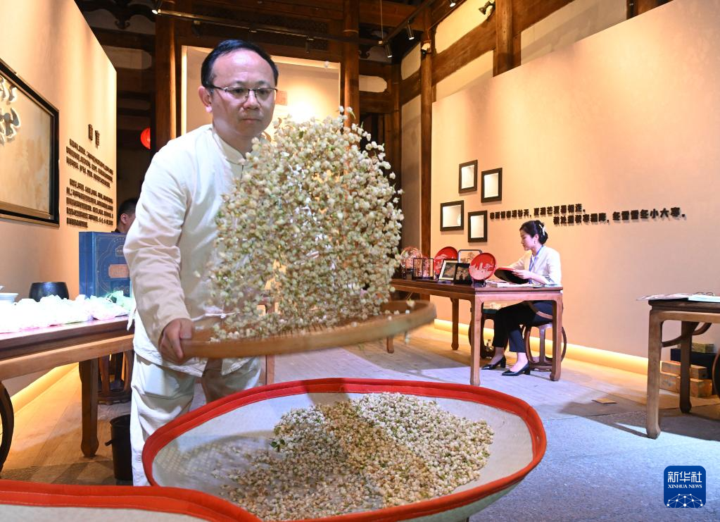 5月18日,非遗传承人在福州市三坊七巷历史文化街区向观众展示茉莉花茶制作工艺。