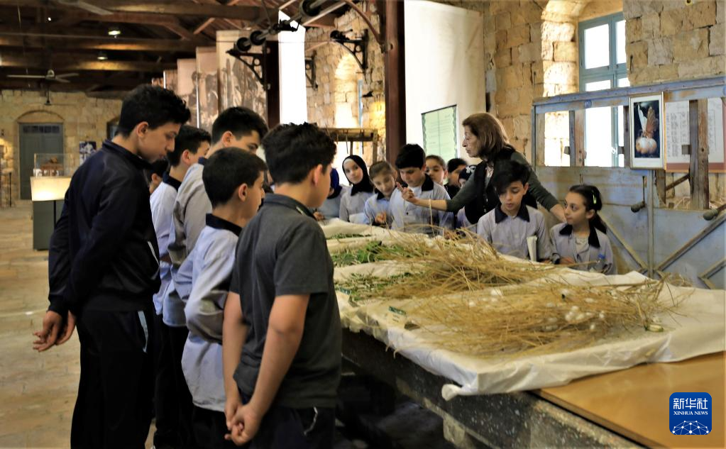 5月17日,在黎巴嫩卜苏斯丝绸博物馆,导游为当地学生讲解。