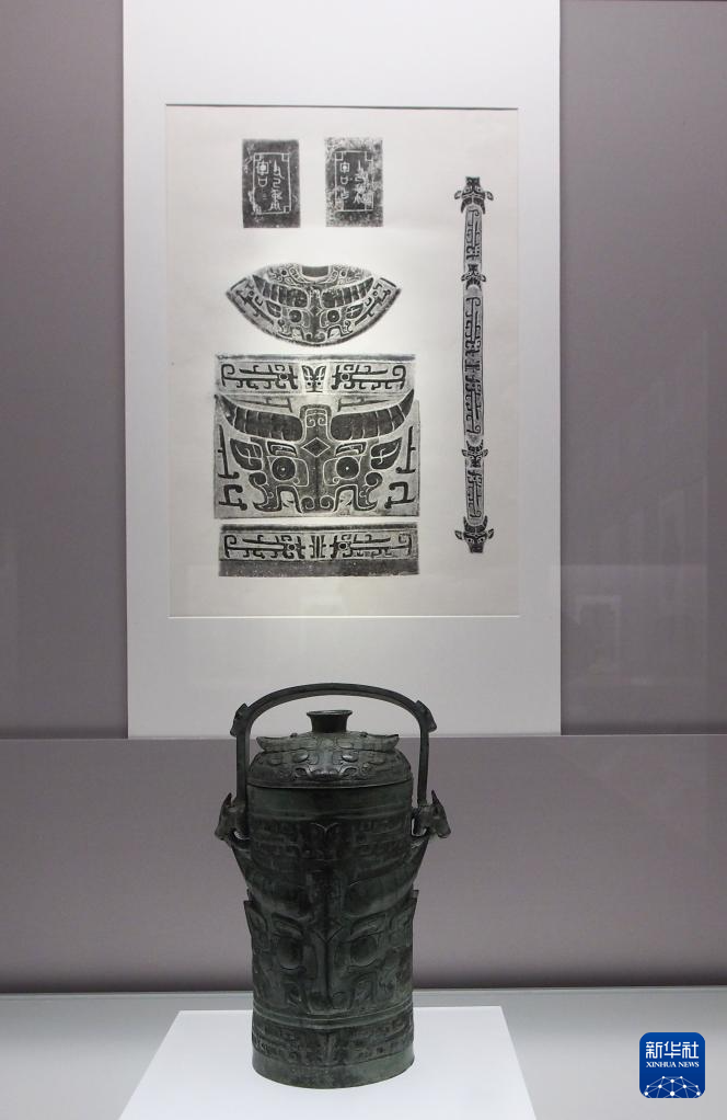 7月6日在上海博物馆展厅拍摄的西周青铜器《古父己卣》及拓本。