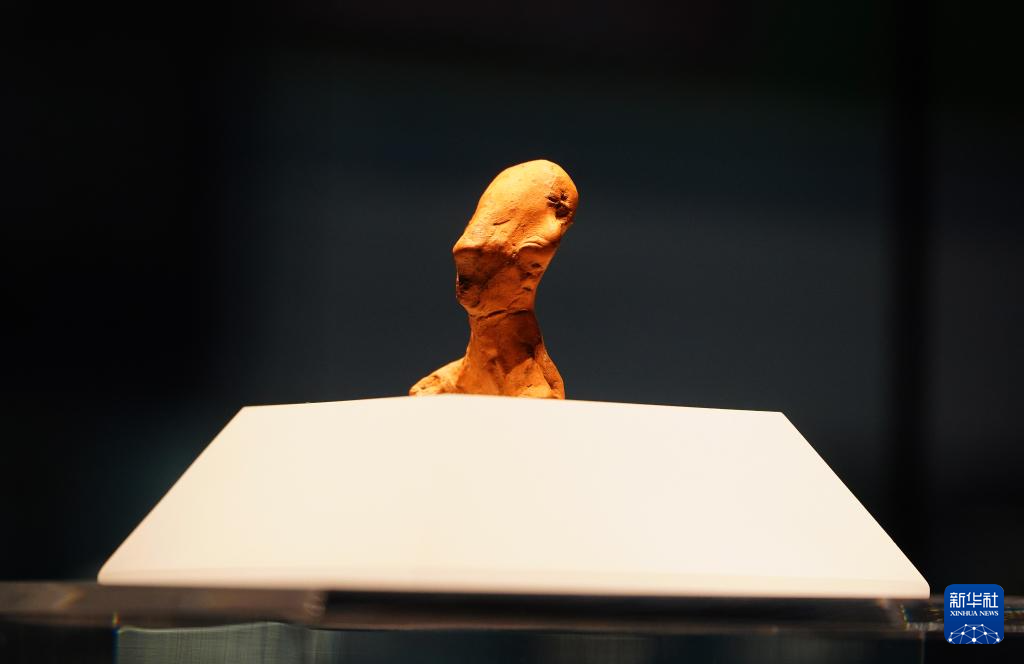 成果展上展出的湖北省文物考古研究院藏龙山时代陶塑人像(7月12日摄)。