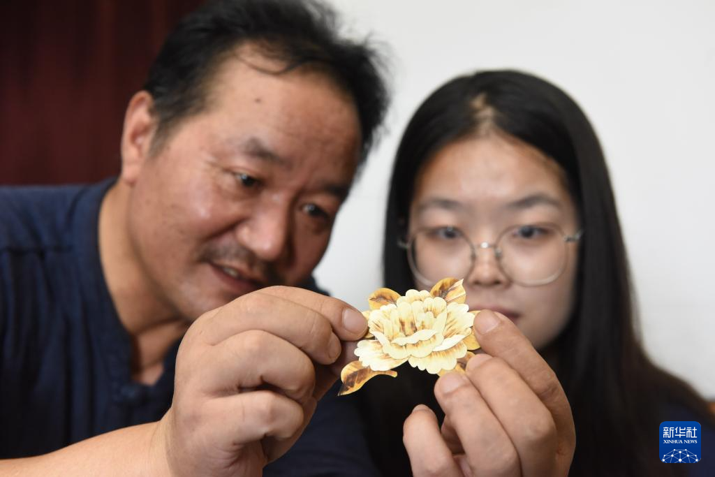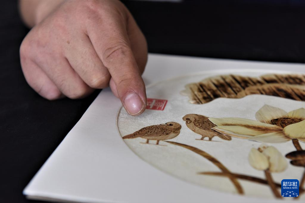 7月12日,吴永龙向学生展示麦秆画的拼接方法。