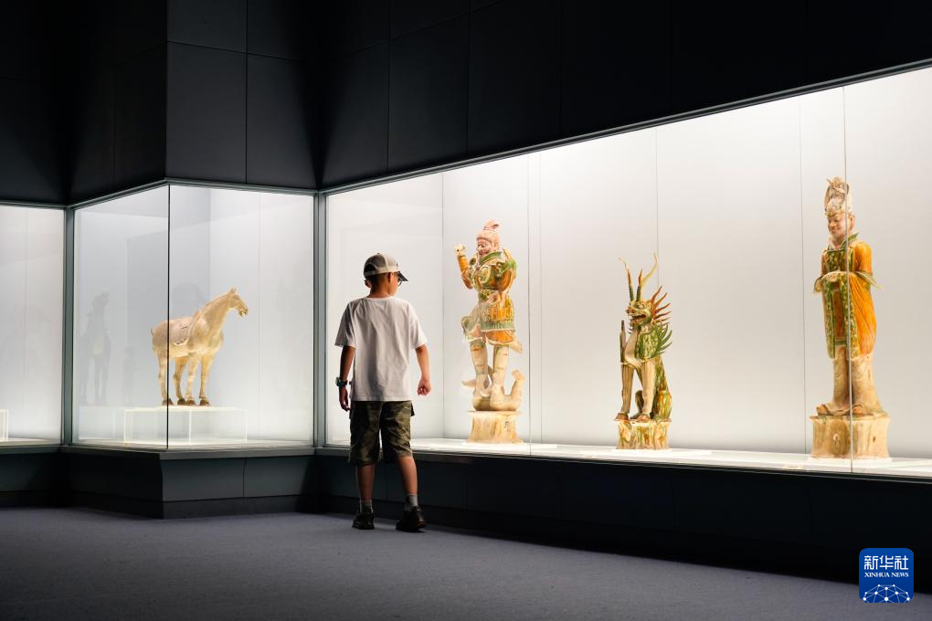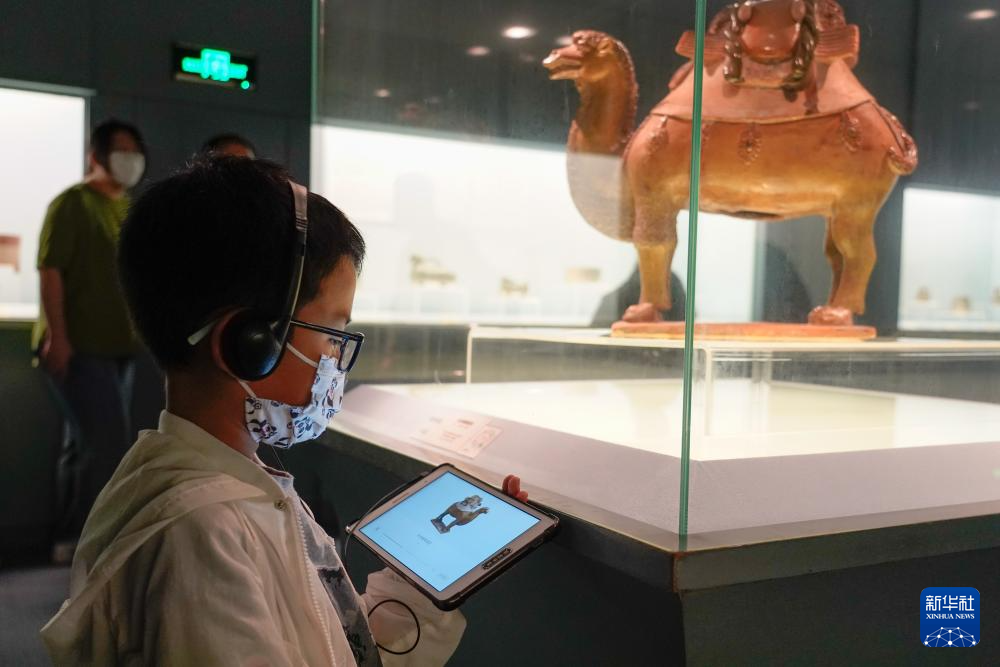 7月14日晚,小朋友在上海博物馆的中国古代陶瓷馆了解彩色釉陶骆驼。