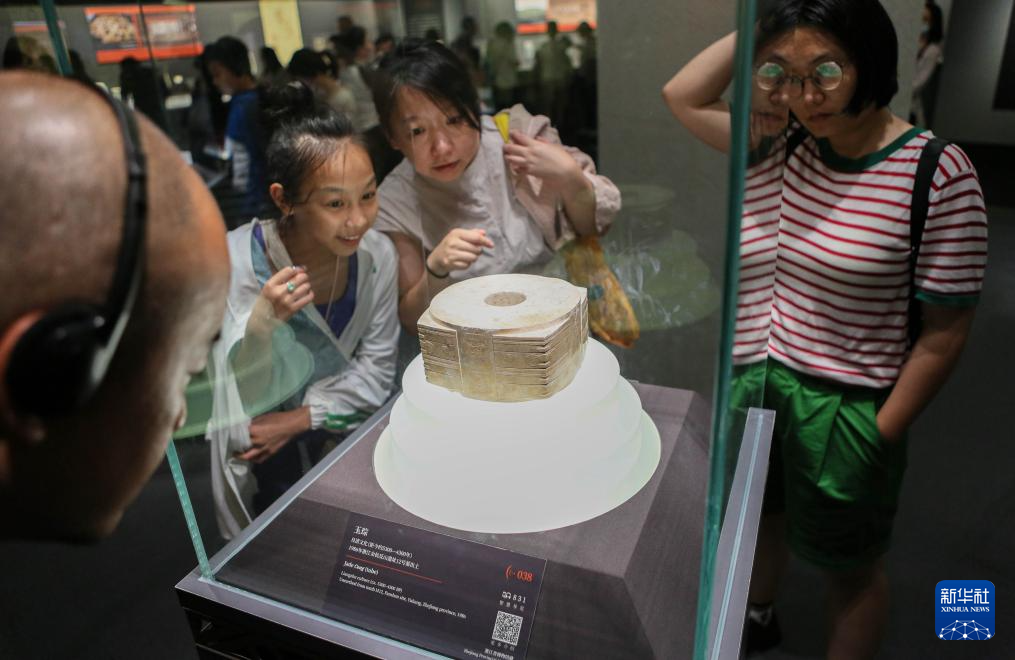 7月14日晚,参观者在上海博物馆“实证中国:崧泽·良渚文明考古特展”观看玉琮。