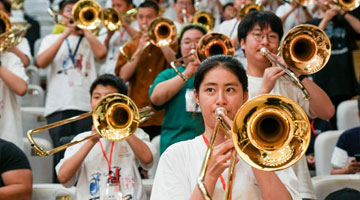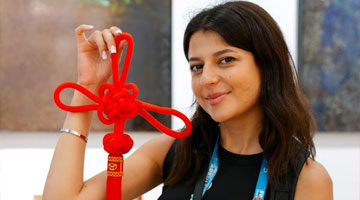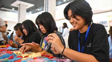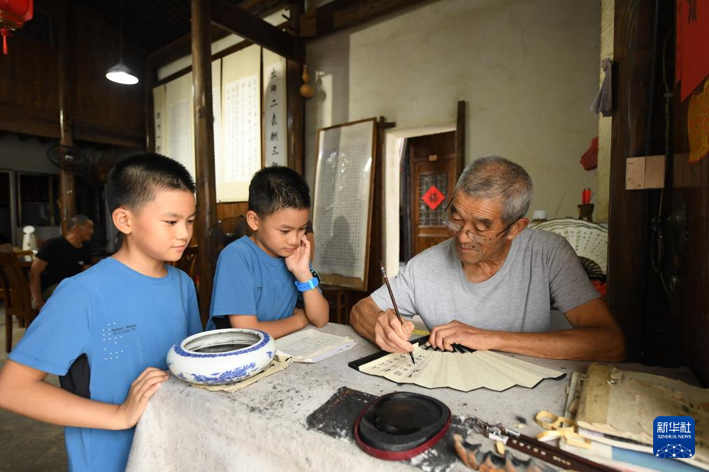8月1日,两名小游客在一位村民家中看他写扇面。