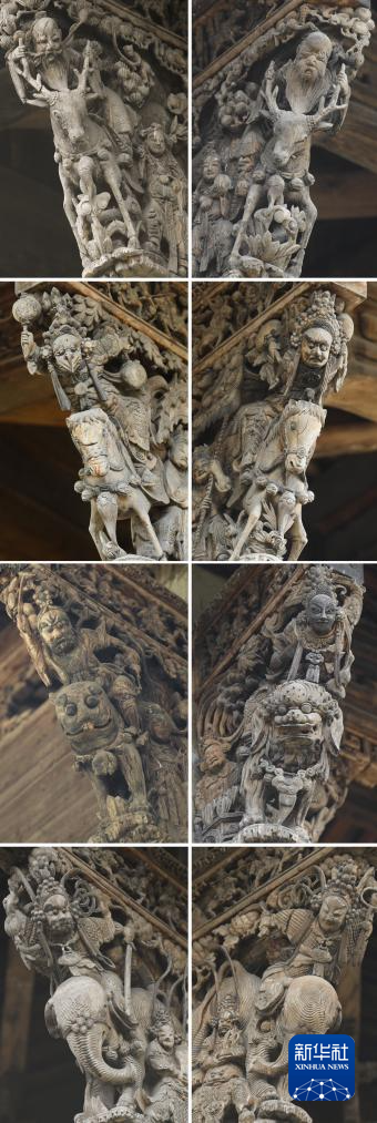 诸葛村丞相祠堂雕刻精湛的“牛腿”(拼版照片,8月1日摄)。