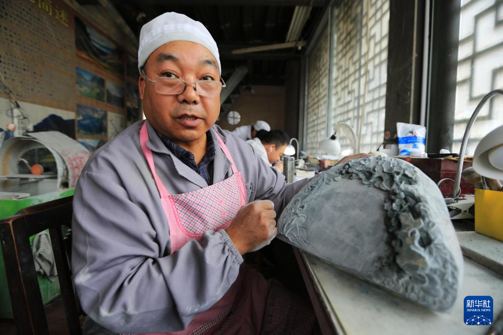 10月24日,艺人在甘肃省定西市临洮县洮砚艺术馆雕刻制作洮砚。