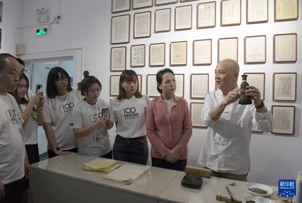 11月8日,魏立中(右一)传授制作木版水印的技艺。