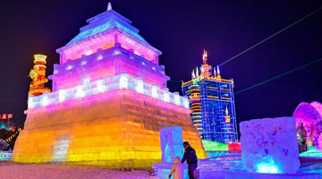 12月14日,工人在哈尔滨冰雪大世界园区建设现场施工。