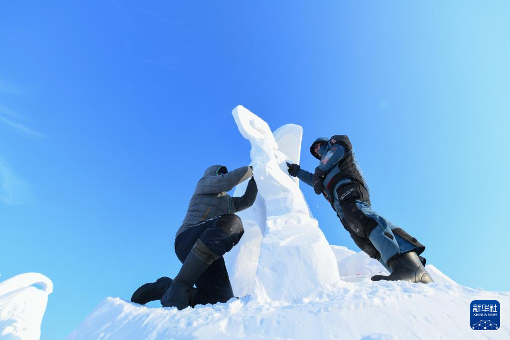 1月8日,选手在太阳岛雪博会园区内制作雪雕。
