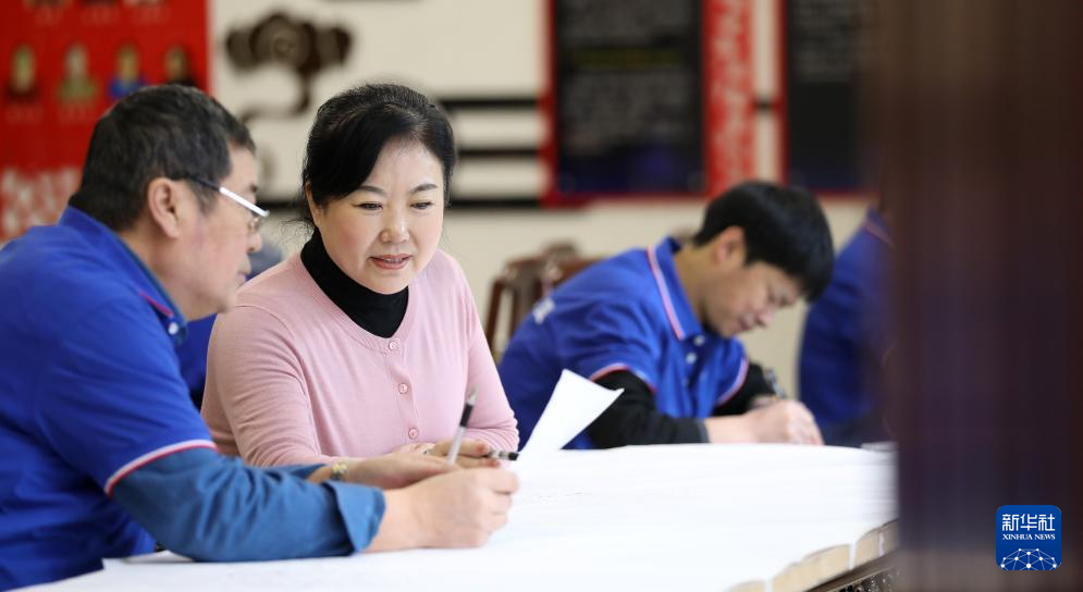 2月27日,刘晶涛(左二)和丈夫谢春波(左一)在凤城市边门镇的车间里探讨画稿创作。