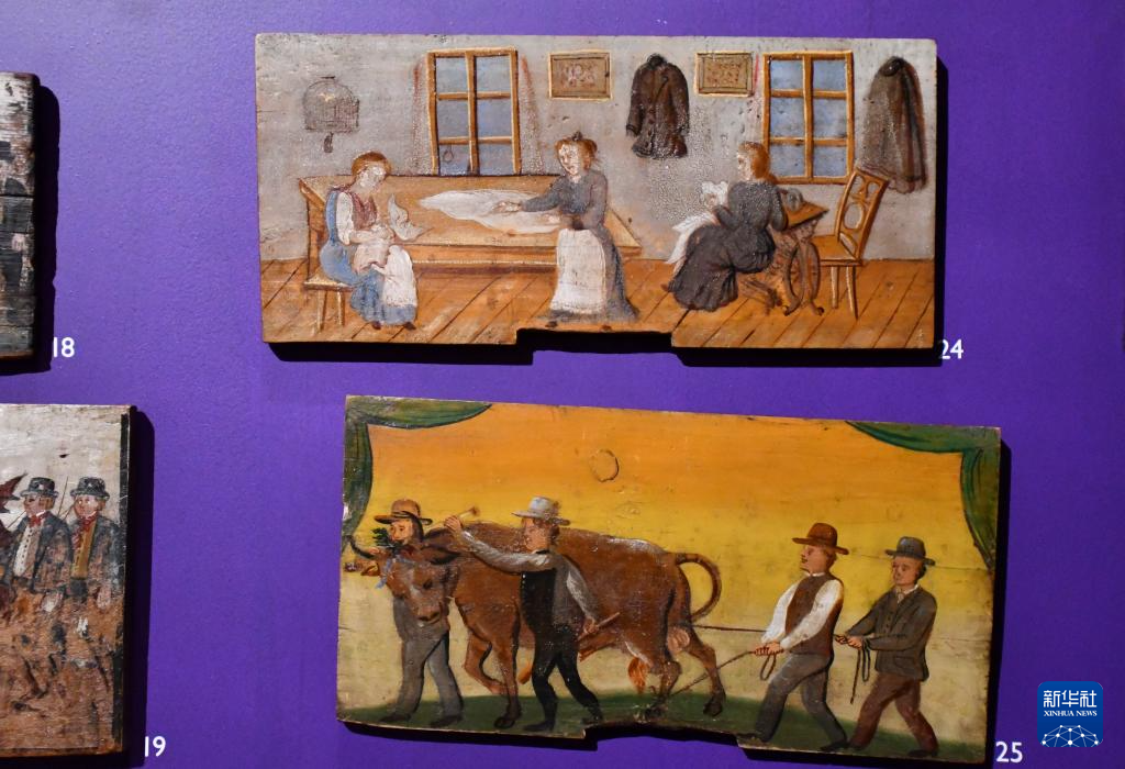 这是5月19日在斯洛文尼亚卢布尔雅那的斯洛文尼亚民族志博物馆拍摄的彩绘蜂箱面板。