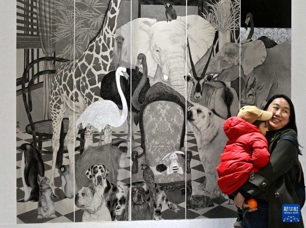 12月15日,观众从一幅动物题材的工笔画作品前经过。
