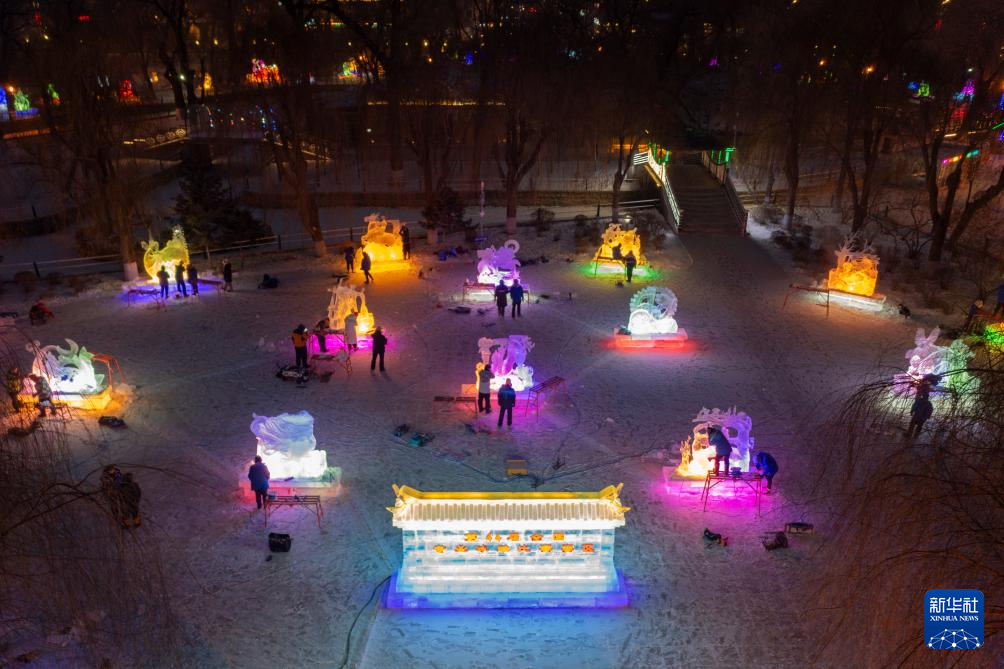 1月7日,在哈尔滨市兆麟公园,冰雕师们在雕琢冰雕作品(无人机照片)。