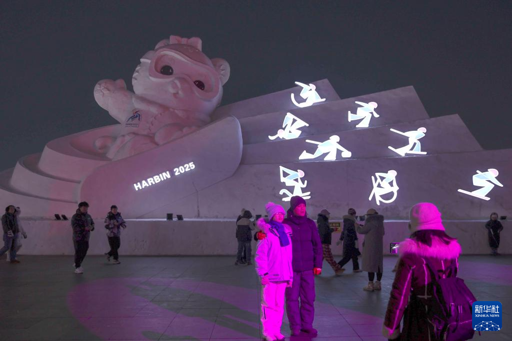 1月5日,在哈尔滨冰雪大世界园区,游客在亚冬会吉祥物雪雕旁游玩、拍照。