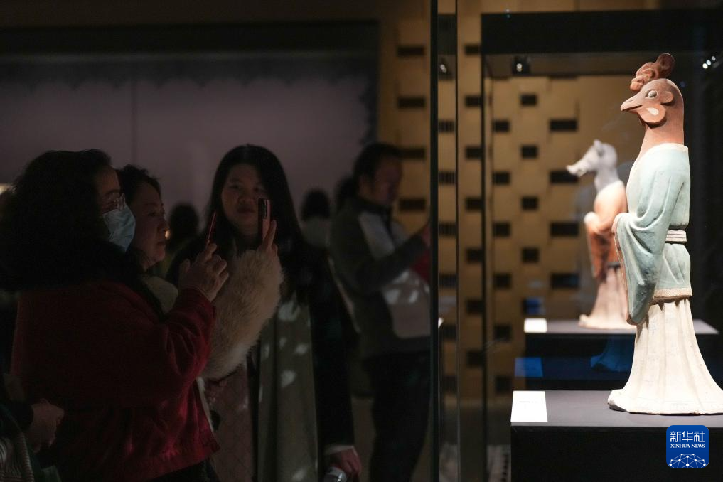1月21日,观众在“聚宝之盆——新疆文物珍品展”观赏鸡首人身俑(复制品)。