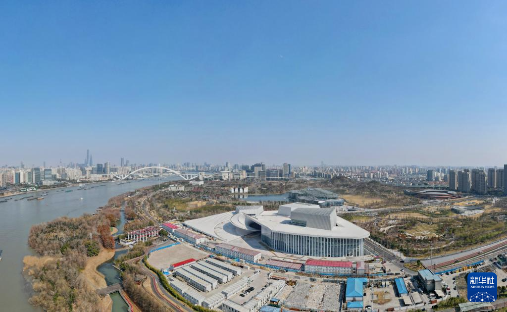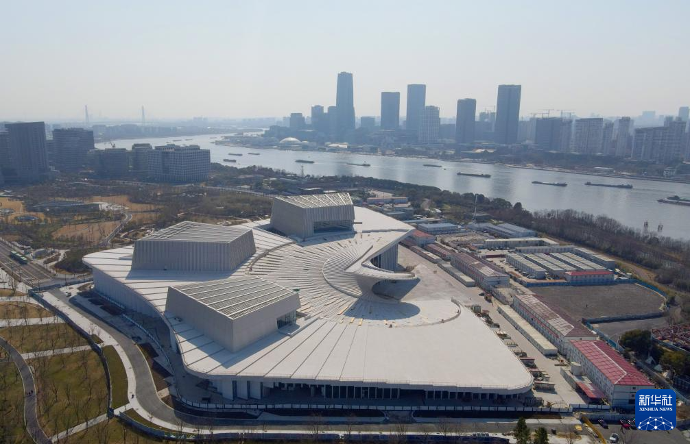 2月13日俯瞰位于世博文化公园内的上海大歌剧院(无人机照片)。